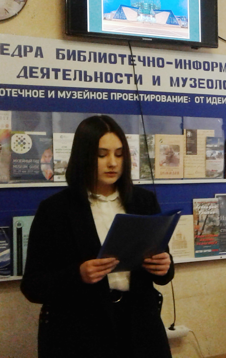 Хочется особо поблагодарить и выразить уважение студенткам Александровой Валерии Эдуардовне – направления подготовки «Режиссура театрализованных представлений и праздников» и Закалинской Ксении Сергеевне – направления подготовки «Социально-культурная деятельность», (Секция №4. Современная социально-культурная ситуация и ее влияние на досуговые предпочтения современной молодежи), подготовившим сообщения о поисковой деятельности, в которой принимают активное участие. Руководитель секции – Дорогонько З.В., кандидат педагогических наук, доцент поблагодарила также за интересные доклады студенток 3 курса очной формы обучения направления подготовки «Режиссура театрализованных представлений и праздников» Ланенкову Юлию Сергеевну, Ковалеву Ольгу Игоревну, Гаврилову Ксению Александровну. Их доклады были посвящены различным аспектам истории киноискусста.