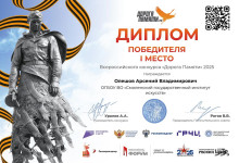 Всероссийский конкурс «Дорога Памяти. Сохранение исторической памяти и мест воинской славы» реализуется в 80-ю годовщину Победы в Великой Отечественной войне, в рамках национального проекта «Молодежь и дети», федерального проекта «Мы вместе» при поддержке Министерства просвещения РФ. 11 участников конкурса вместе с наставником команды Мертенс Е.С., к.п.н., доцентом, зав. кафедрой Музеологии и культурного наследия, получили Диплом Победителя – 1-ое место. Конкурсная работа включала подготовку информационной справки об объекте памятного места в формате энциклопедической статьи; фотоматериалы и видеоматериалы об объекте памятного места; аудиофайл с озвучиванием информационной справки об объекте памятного места в формате энциклопедической статьи. Всего подготовлено для размещения на виртуальной онлайн-карте регионов России 21 объект культурного наследия, находящихся на территории Смоленщины.