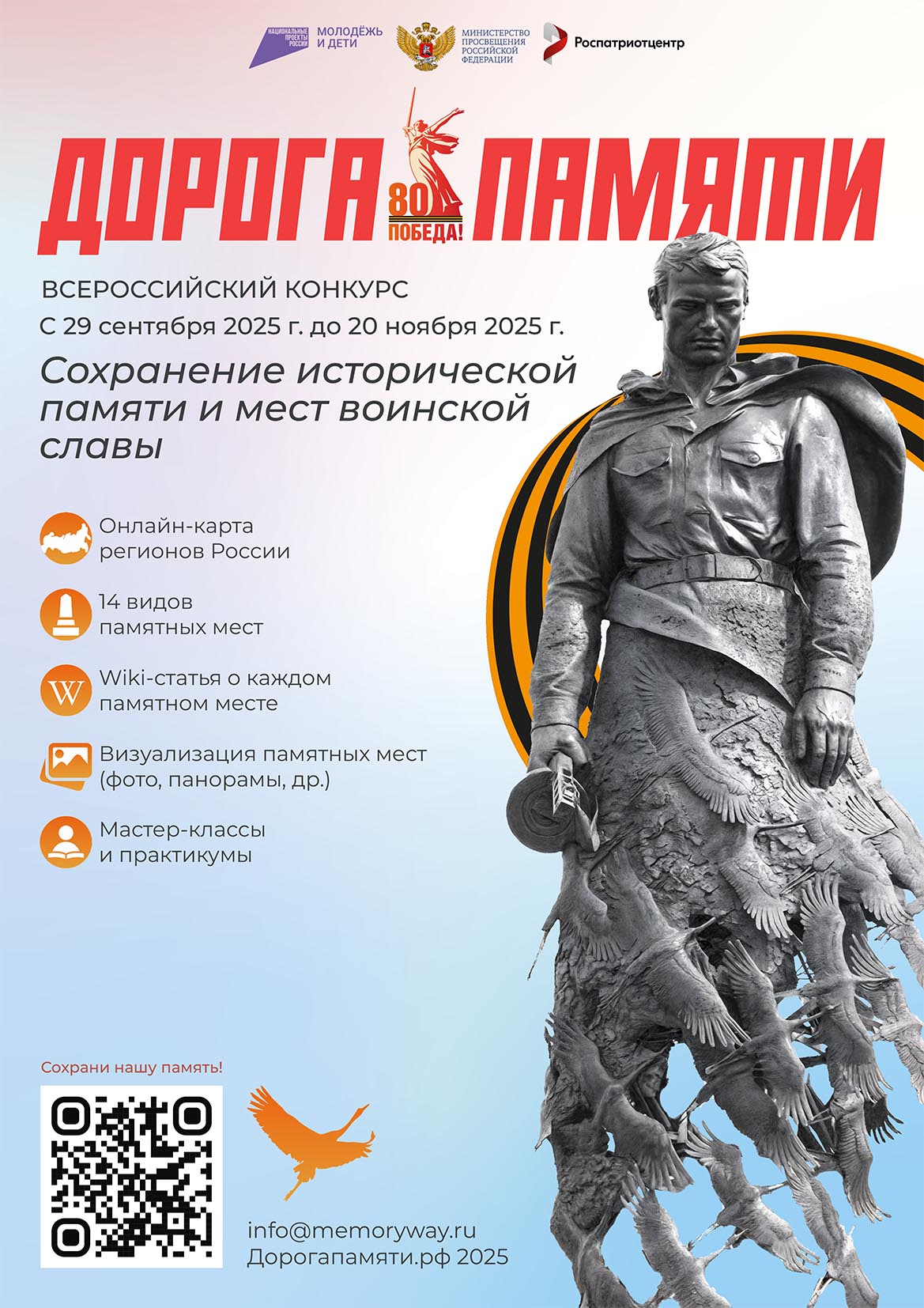 Всероссийский конкурс «Дорога Памяти. Сохранение исторической памяти и мест воинской славы» реализуется в 80-ую годовщину Победы в Великой Отечественной войне, в рамках национального проекта «Молодежь и дети», федерального проекта «Мы вместе» при поддержке Министерства просвещения РФ.