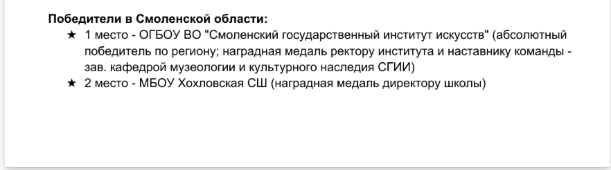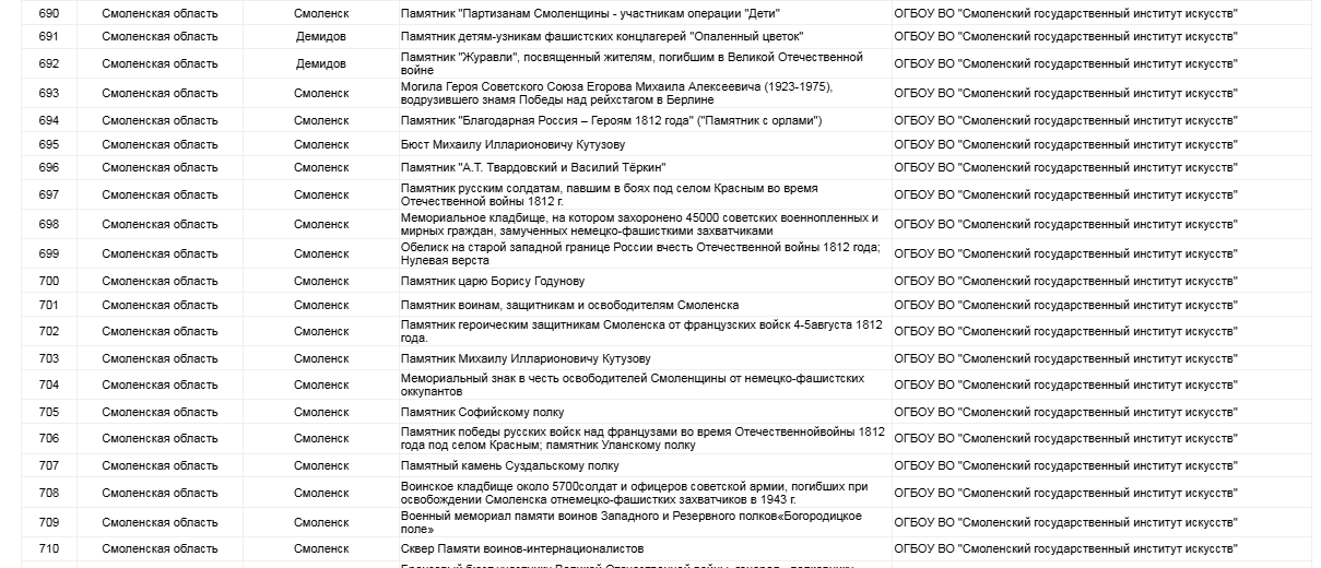 Смоленский государственный институт искусств завоевал титул абсолютного победителя по региону во Всероссийском конкурсе «Дорога Памяти. Сохранение исторической памяти и мест воинской славы» и занял 1-ое место. Такая высокая оценка компетентного жюри и экспертов конкурса дана команде студентов 4-го и 2-го курсов направления «Музеология и охрана объектов культурного и природного наследия». В рамках Конкурса «Дорога Памяти» участники создавали конкурсные работы о памятных исторических местах, посвященных героям Великой Отечественной войны, другим военным конфликтам, сражениям и выдающимся событиям русской армии по 14 категориям. Конкурсная работа включала подготовку информационной справки об объекте памятного места в формате энциклопедической статьи; фотоматериалы и видеоматериалы об объекте памятного места; аудиофайл с озвучиванием информационной справки об объекте памятного места в формате энциклопедической статьи. Всего 898 работ из 1135 работ с памятными местами из 66 регионов допущены к размещению на интерактивной карте мест воинской славы по регионам России.