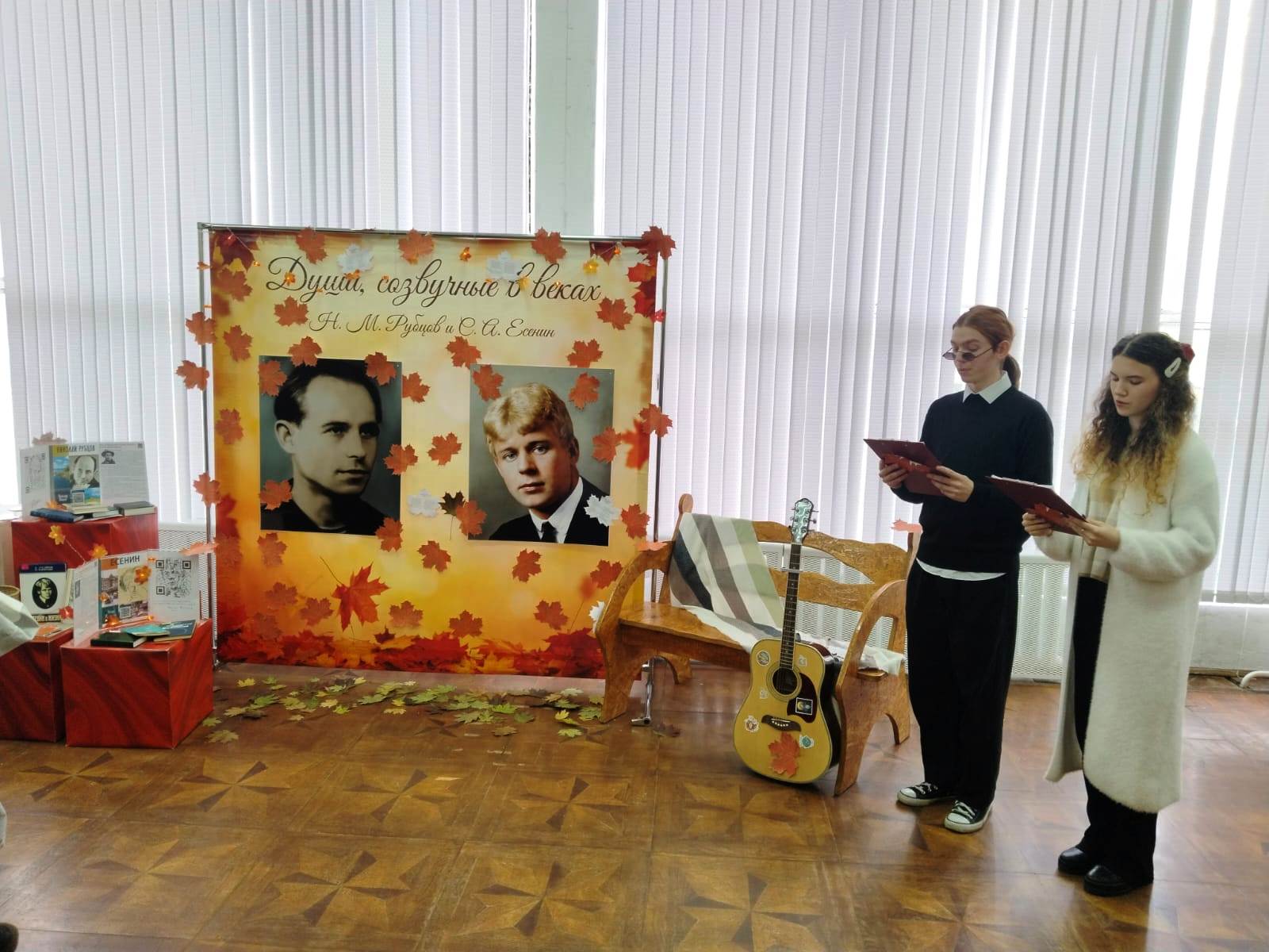 На стендах библиотечной выставки были представлены печатные издания, QR-коды, ведущие к стихам на сайтах, а также краткие биографии поэтов. В качестве метафоры творчества С.А. Есенина и Н.М. Рубцова организаторы выбрали образ "клена опавшего", воплотив его в оригинальной форме с кленовыми листьями-стихами. Каждый желающий мог сорвать лист-стихотворение и унести с собой частицу поэзии.