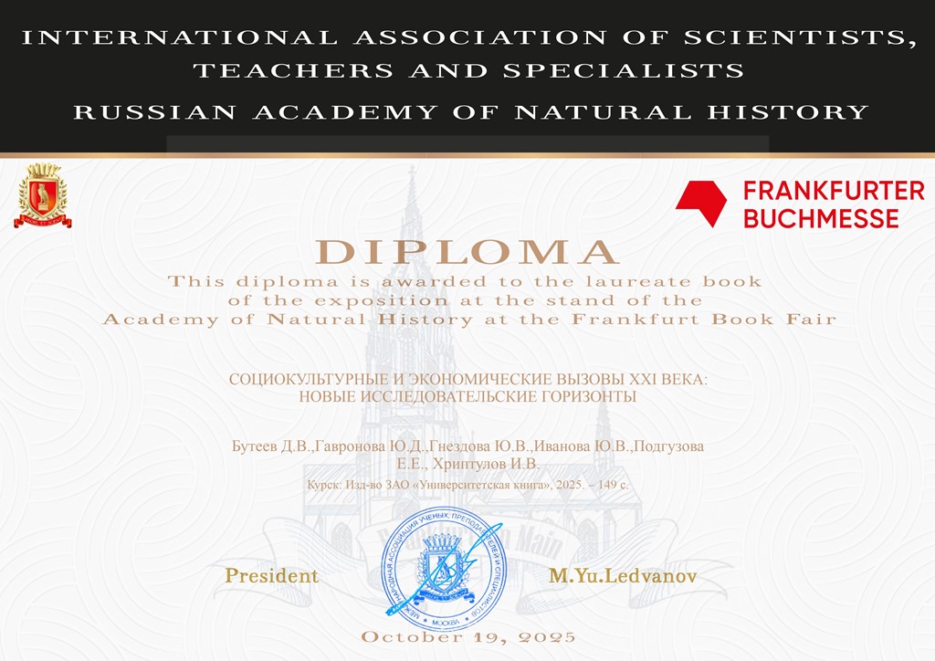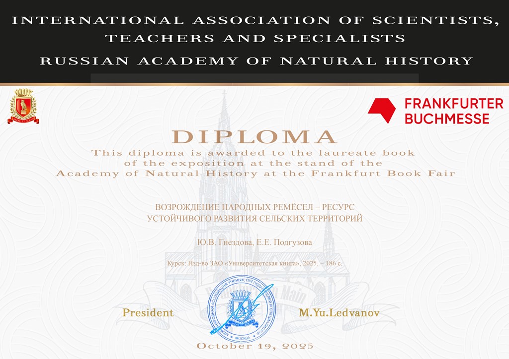Монография «Социокультурные и экономические вызовы XXI века: новые исследовательские горизонты» коллектива авторов: Дмитрий Валерьевич Бутеев, Юлия Дмитриевна Гавронова, Юлия Владимировна Гнездова, Юлия Витальевна Иванова, Елена Евгеньевна Подгузова и Игорь Викторович Хриптулов и монография Юлии Владимировны Гнездовой и Елены Евгеньевны Подгузовой «Возрождение народных ремёсел – ресурс устойчивого развития сельских территорий» стали лауреатами книжной ярмарки во Франкфурте.