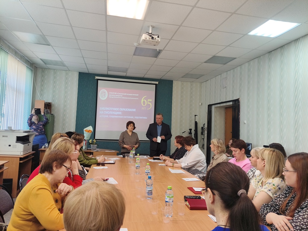 С приветственным словом к собравшимся и пожеланиями плодотворной работы обратился ректор СГИИ А.Н. Серый. Многолетние традиции библиотечного отделения культурно-просветительного училища, а затем вуза, 65 лет успешно готовящих кадры в сфере библиотечно-информационной деятельности, представили педагоги кафедры: канд. пед. наук, доцент Е.С. Мертенс (зав. кафедрой в 2008–2023 гг.), канд. пед. наук, доцент Е.В. Горбылева и зам. директора ГБУК «Смоленская областная универсальная научная библиотека им. А.Т. Твардовского», педагог кафедры (до 2025 г.) Е.В. Гаврилова. И.о. зав. кафедрой библиотечно-информационной деятельности (с 2023 г.), канд. пед. наук, доцент Т.Н. Ладожина представила перспективы работы кафедры, а также презентацию «Наша гордость – выпускники направления подготовки "Библиотечно-информационная деятельность" и специальности "Библиотечное дело"» о выпускниках, работающих в библиотечной, образовательной и научной сфере на Смоленщине, в Москве, Санкт-Петербурге и других регионах. Для обсуждения на мероприятии были представлены вопросы: подготовка библиотечных кадров в контексте профессионального стандарта «Специалист по библиотечно-информационной деятельности» (2022) и пути развития библиотечного образования на Смоленщине. В дискуссии приняли участие специалисты ГБУК «Смоленская областная универсальная научная библиотека им. А.Т. Твардовского»; ГБУК «Смоленская областная библиотека для детей и молодежи им. И.С. Соколова-Микитова»; ГКУК «Смоленская областная специальная библиотека для слепых», МБУК «ЦБС города Смоленска», библиотеки ФГБОУ ВО «Смоленский государственный медицинский университет», библиотеки филиала ФГБОУ ВО «НИУ Московского энергетического института» в г. Смоленске, библиотеки ФГБОУ ВО «Смоленский государственный университет», МБУК «Смоленская межпоселенческая ЦБС» МО «Смоленский район», МБУК «Сафоновская районная централизованная библиотечная система»; МБУК «Краснинская ЦБС», библиотеки Смоленского фельдмаршала Кутузова кадетского корпуса и библиотеки МБОУ «Средняя школа № 29 с углубленным изучением отдельных предметов» г. Смоленска.