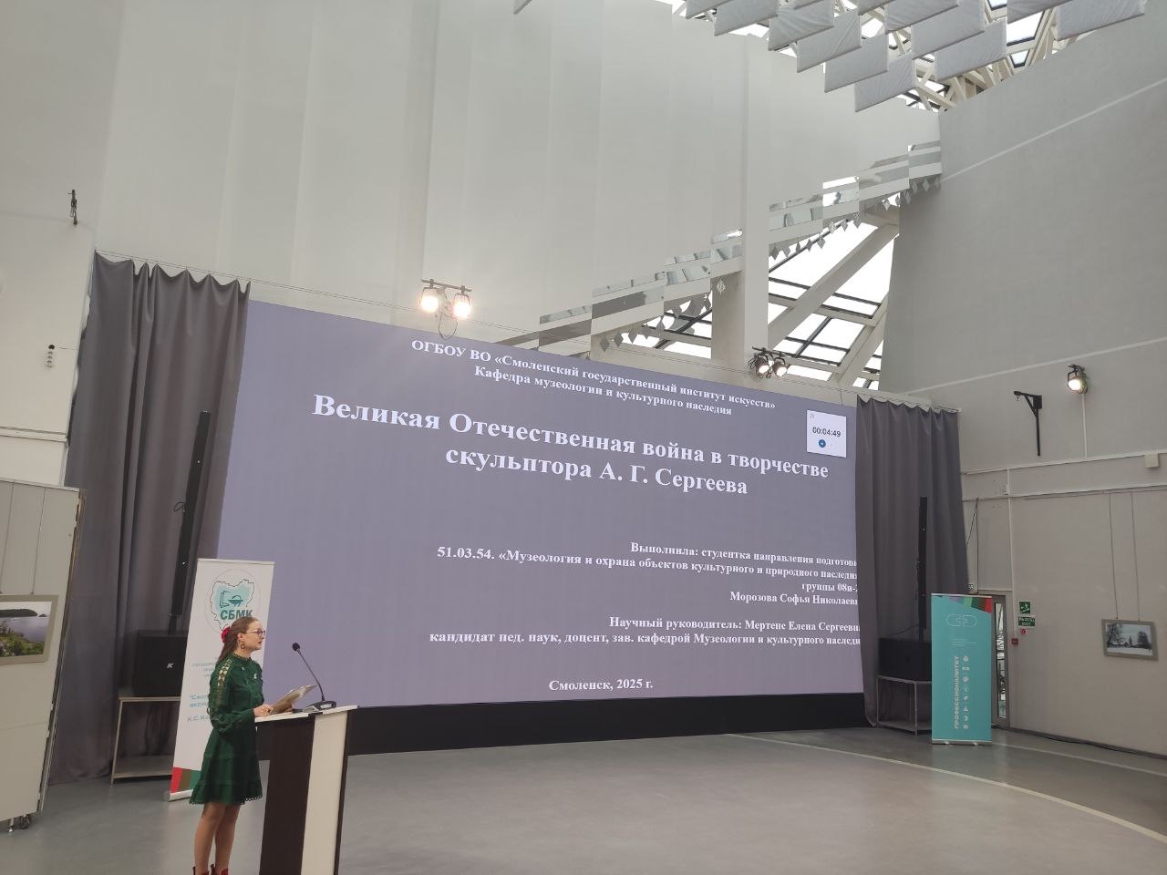 Исследование Софьи Морозовой – «Тема Великой Отечественной войны в творчестве скульптора Альберта Сергеева», выполнено под научным руководством доцента, кандидата педагогических наук, заведующей кафедрой музеологии и культурного наследия Е.С. Мертенс. Работа Софьи была высоко оценена, и она удостоена Диплома III-ей степени.